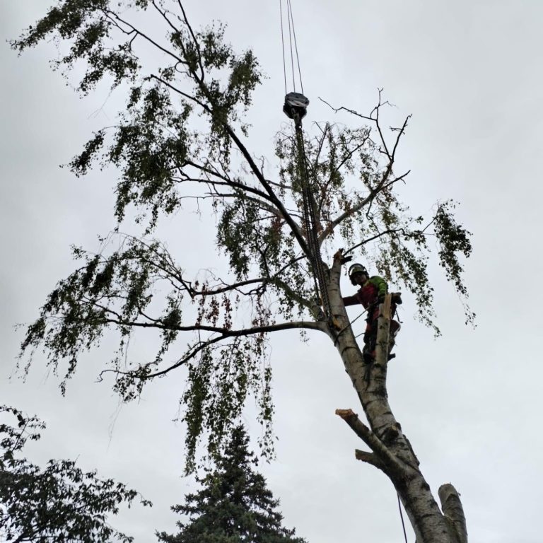 Seilklettertechnik (SKT): Der Baum wird Stück für Stück von oben nach unten abgetragen. Äste und Stammteile werden kontrolliert abgeseilt, um Schäden zu vermeiden.
